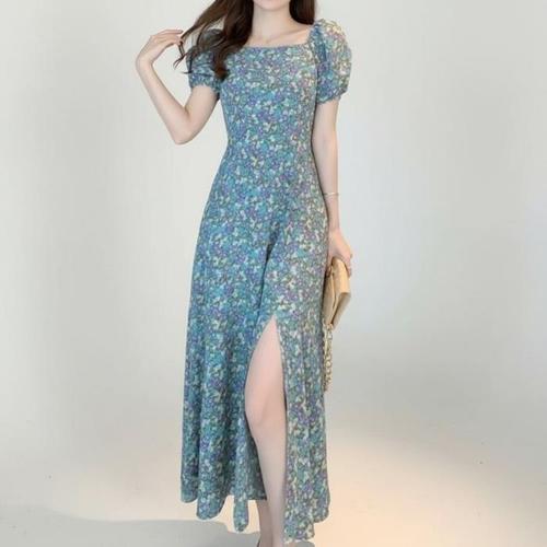 [신상오픈런]여성 스퀘어넥 퍼프 소매 앞트임 플레어 롱 드레스 (46200138)