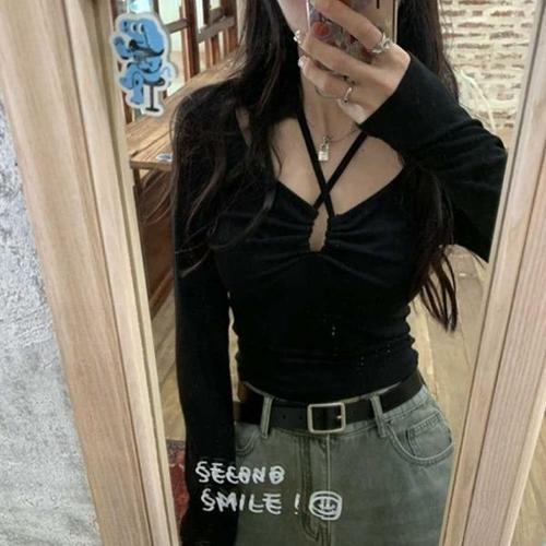 [엄지척]여자 청바지 블랙 긴팔 티셔츠 스트랩 트임_19627834_667501