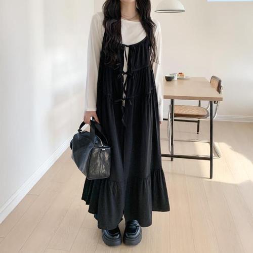 데일리앤 이올라 민소매 이너 레이어드 나시 플레어 캉캉 셔링 롱 바스락 원피스 봄 여름 가을