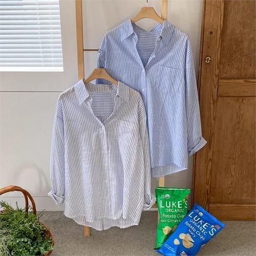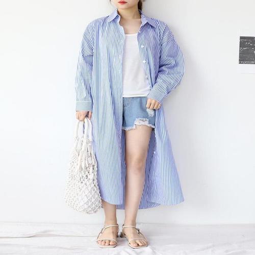 [다잇템]여성 단가라 파란색 베이직 롱 여유핏 셔츠