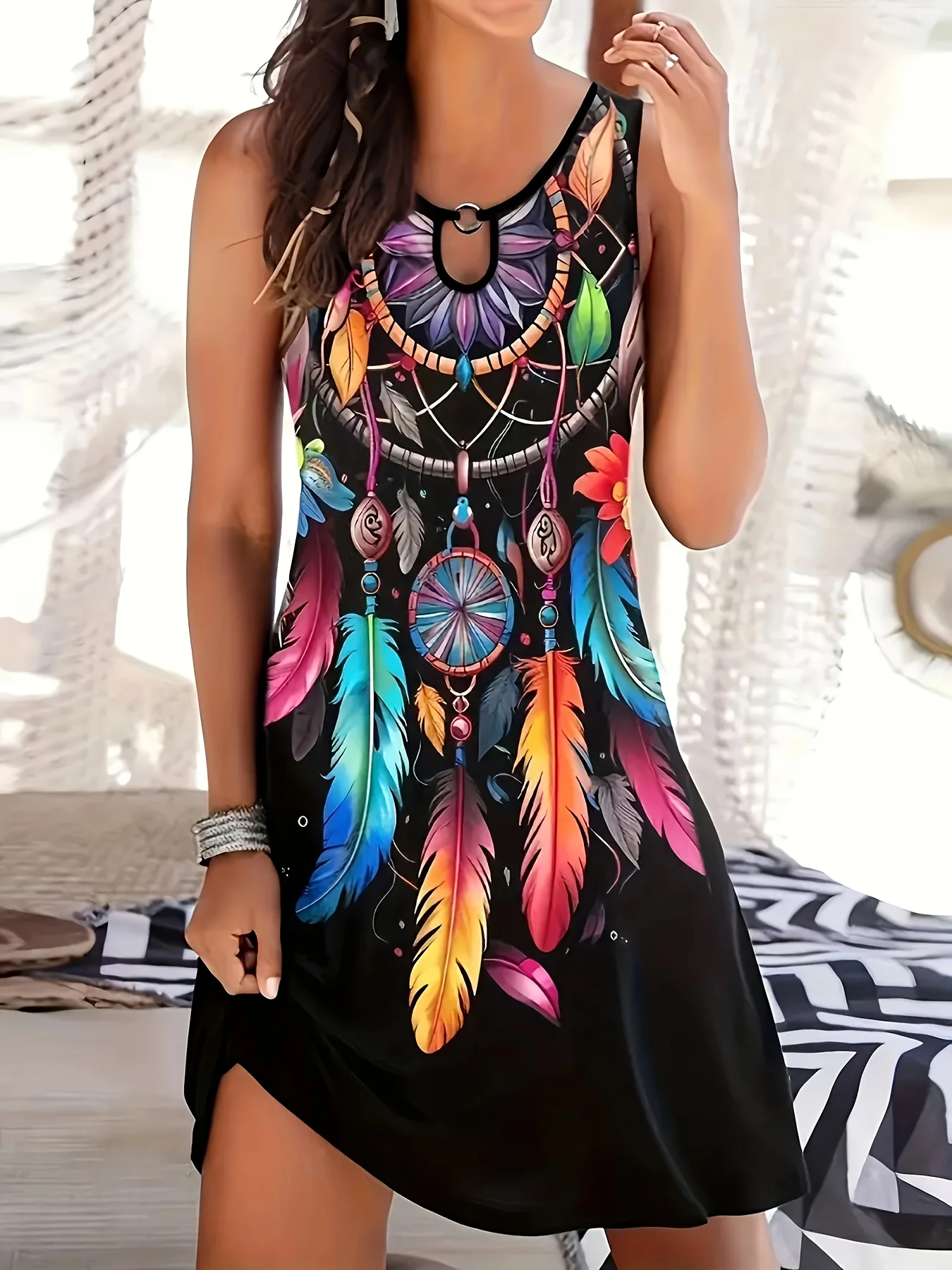 추상적인 프린트가 있는 여성용 민소매 브이넥 바닥 길이 드레스 - 해변 및 캐주얼 행사에 유행
