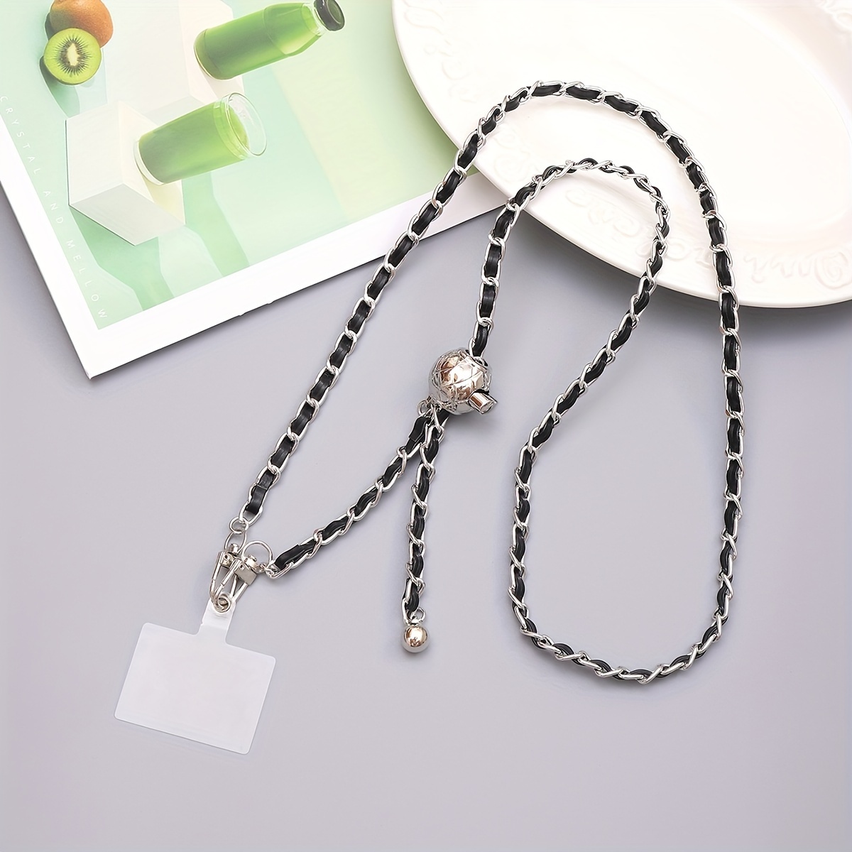 TEMU 건 블랙 실버 체인 PU 클립 인조 가죽 조절 가능한 롱 크로스바디 모바일 폰 랜야드 투명 카드 포함