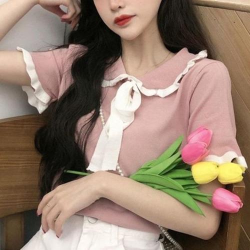 [엄지척]여성 레이스 카라 리본 팔 셔링 데일리 반팔티_19599249_667501