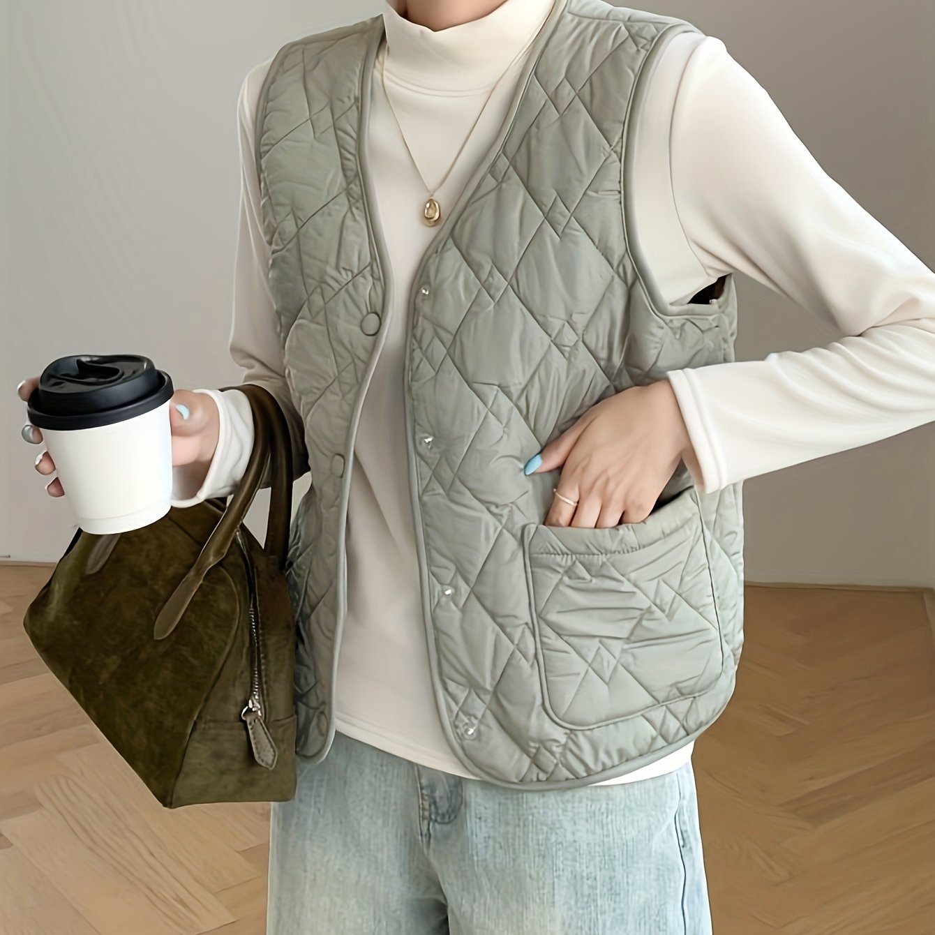 TEMU 여성용 경량 기모 안감 포켓 따뜻한 조끼, 캐주얼 외层용으로 적합, 짧은 단추형 민소매 탑.|민소매