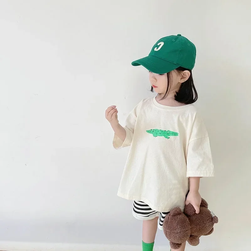 한국어 스타일 여름 키즈 티셔츠 귀여운 만화 프린트 루즈 피트 드롭 어깨 미드 슬리브 탑 아기 소년 소녀 유아 의류