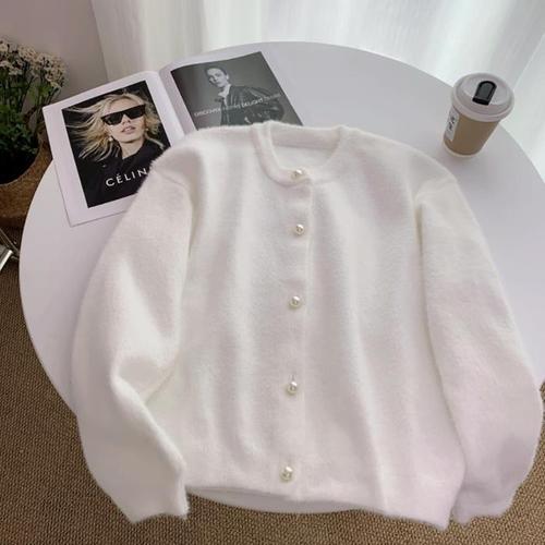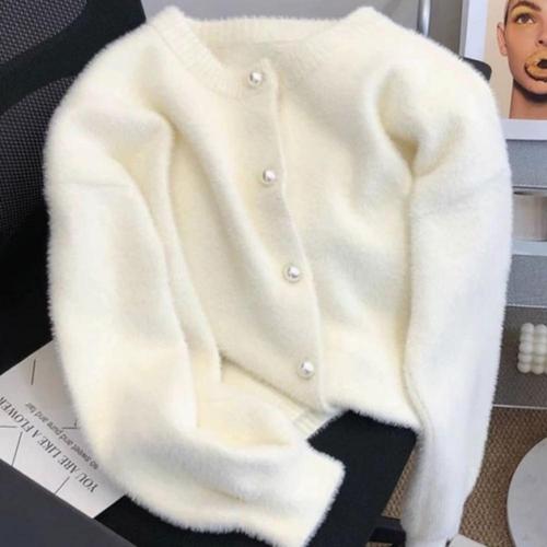 [신상오픈런]여성 루즈핏 두꺼운 퍼 진주 단추 라운드넥 니트 가디건 (46120383)