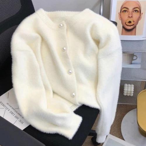 [신상오픈런]여성 진주 버튼 장식 둥근 목 퍼 니트 가디건