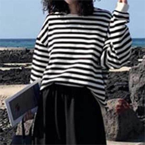 [다잇템]여자 박시핏 단가라 줄무늬 퍼프긴팔 맨투맨 (9408130A)