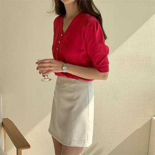 F007322_캉캉주름 V넥 퍼프소매 블라우스 티셔츠
