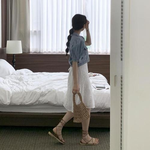 반팔 데님 셔츠 원피스 여름 뷔스티에 크롭 퍼프 여자 WFLQ833