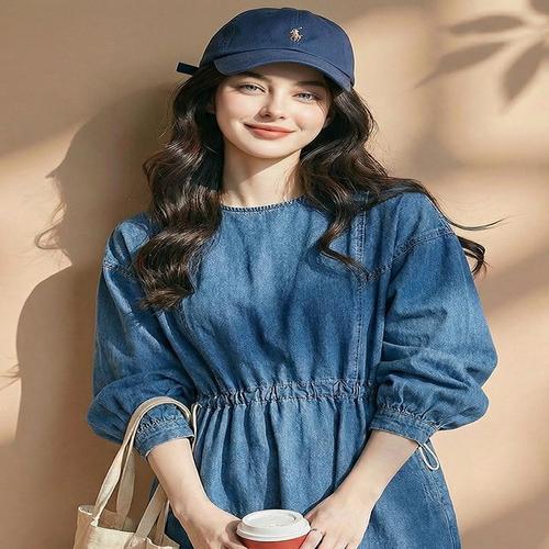 [신상오픈런]여성용 데일리 포켓 디자인 퍼프소매 데님 롱 원피스