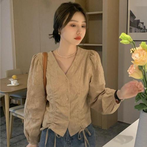 [옷자락]여자 브이넥 퍼프 소매 크롭 스타일 블라우스