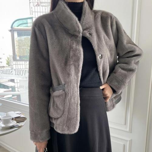ROYALBELLE 여성 스탠드카라 루즈핏 데일리 숏 자켓 컴포트 소프트 단색 밍크 퍼 코트 D0110624