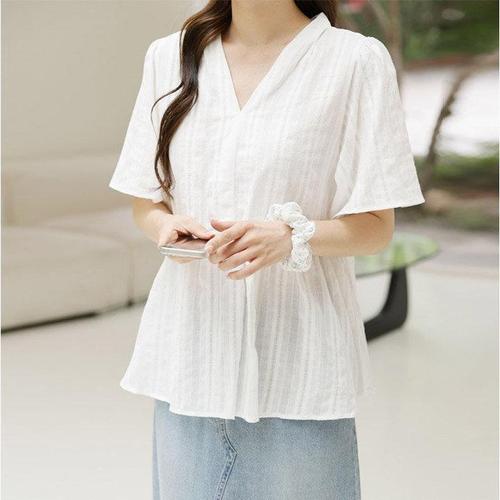 펀칭 레이스 플라워 자수 A라인 반팔 블라우스