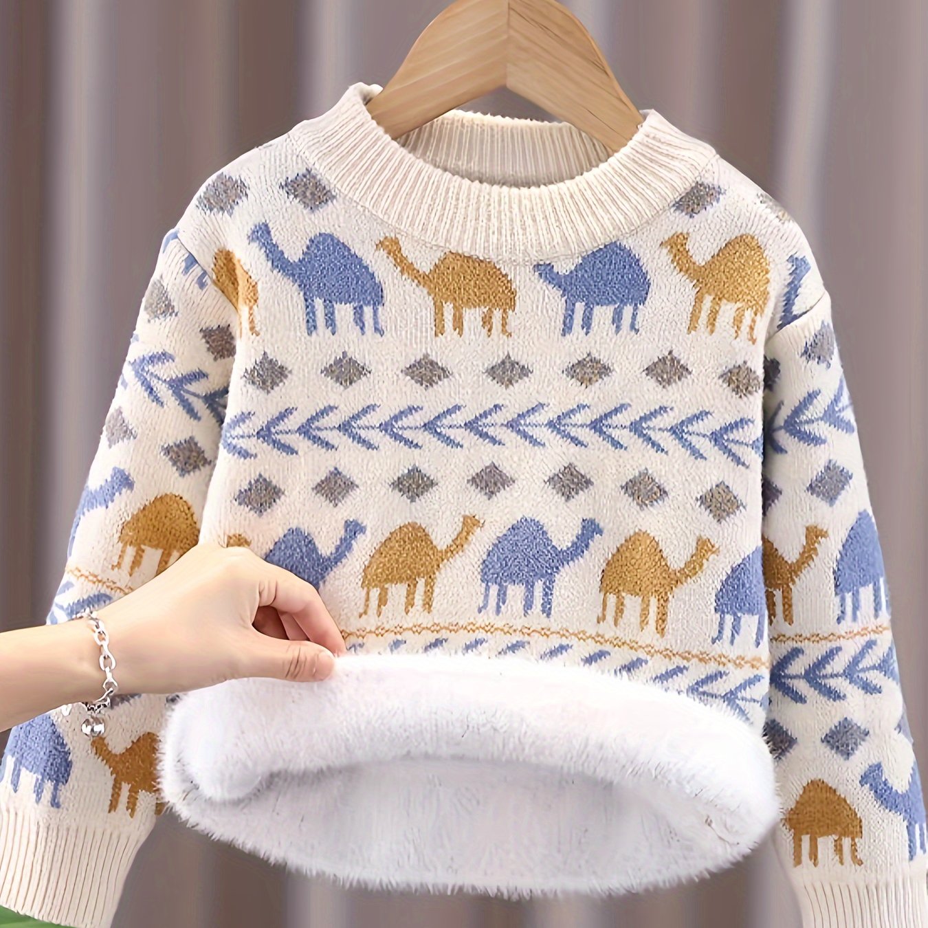 TEMU 소년용 두꺼운 벨벳 니트 스웨터 - 겨울 따뜻한 카툰 캐멜 & 패턴 긴팔 라운드넥 핸드워시 가능한 편안한 유아복, 유행하는 키즈 패션, 부드러운 소재 의류