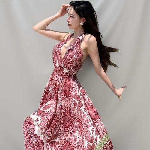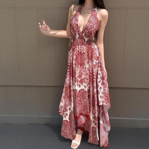 [신상오픈런]여성 여름 바캉스 페이즐리 트임 나시 언발란스 쉬폰 롱 드레스