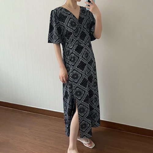 [옷자락]여성 페이즐리 옆트임 중년 반팔 롱원피스