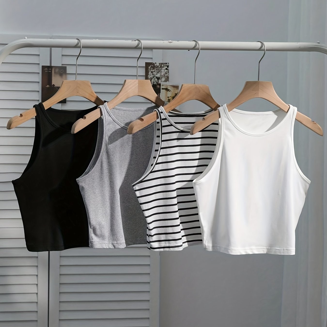 TEMU 부드럽고 신축성 있는 원단으로 제작된 여성용 민소매 탑 4종 세트. 루즈핏으로, 블랙, 화이트, 핑크, 그레이의 네 가지 단색으로 제공됩니다. 봄, 여름의 캐주얼 레이어링에 이상적이며, 패딩이 없는 부드러운 디자인을 특징으로 합니다. 미니 소매가 있는 기본적인 탱크 탑입니다.