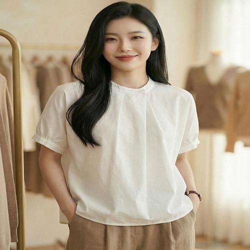 [드레스허그]원버튼 포인 차이나넥 반팔 블라우스