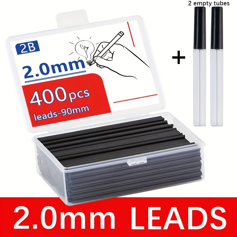 TEMU 400개/박스 2.0mm 자동 연필심 대용량 교체형 자동연필심 2B 검정색, 빈 튜브 2개 무료 선물, 부드러운 필기감, 필기 미술 페인팅 문구용품에 적합