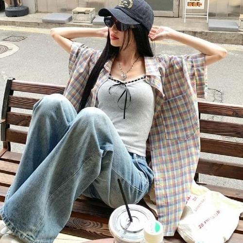 |KSH3F0B|여성 남성 오버사이즈 체크 여름 반팔 셔츠 포켓