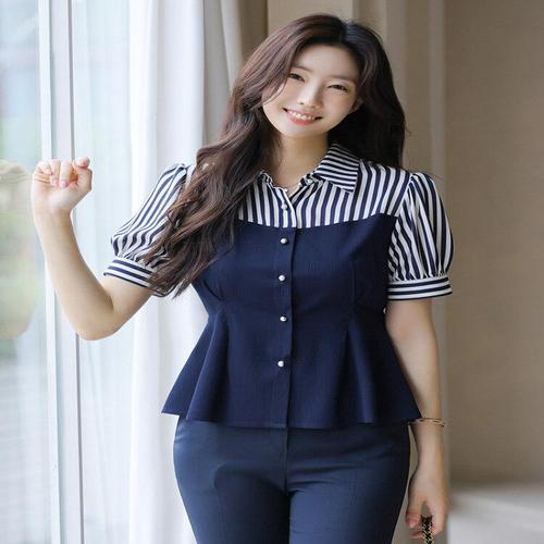 [스타일온미][루이스엔젤] 리유나 스트라이프 카라 뷔스티에 배색 페플럼 블라우스
