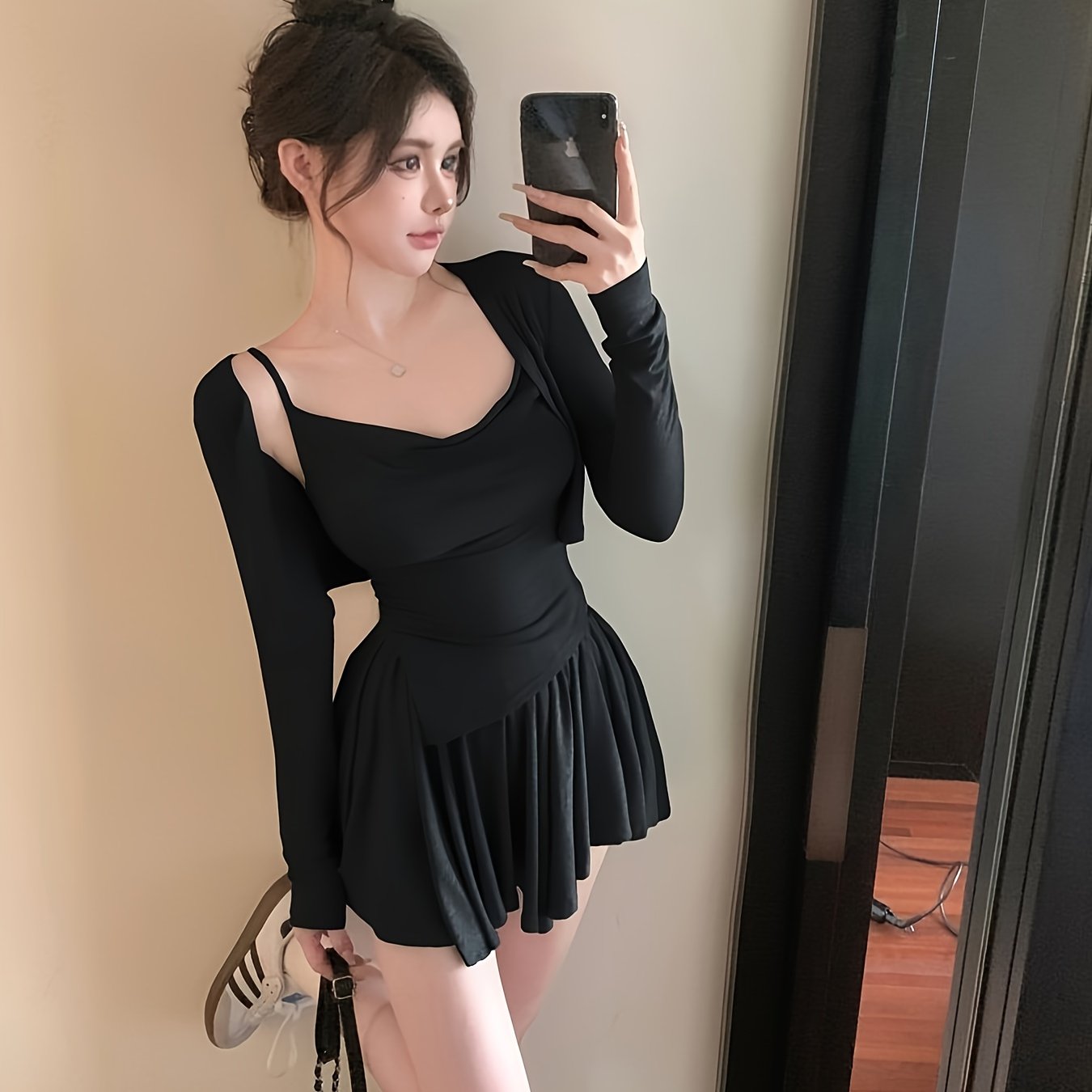 TEMU 여성용 한국 스타일 가을 겨울 캐주얼 시크 의상 - 베이지 긴팔 가디건, 스퀘어 넥 탑 & 플리츠 스커트 세트, 단색, 사계절 착용 가능, 캐주얼 복장 | 세련된 스타일 | 스퀘어 넥라인, 한국 패션, 스커트 및 탑 세트