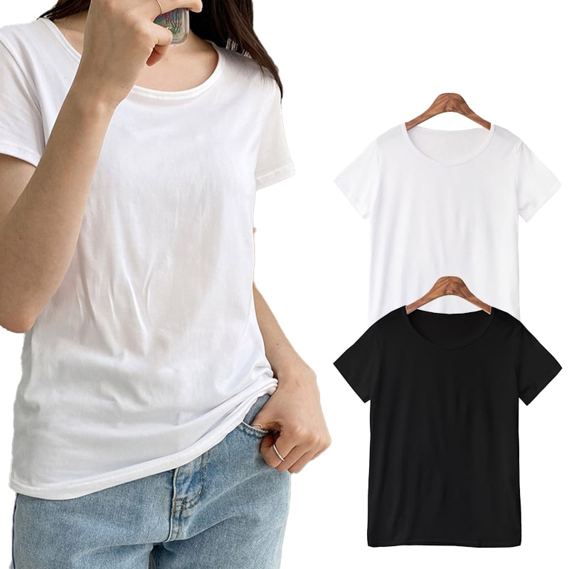 폴리에스터 여름 반팔티 여성 라운드넥 흰 검정 기본 티셔츠
