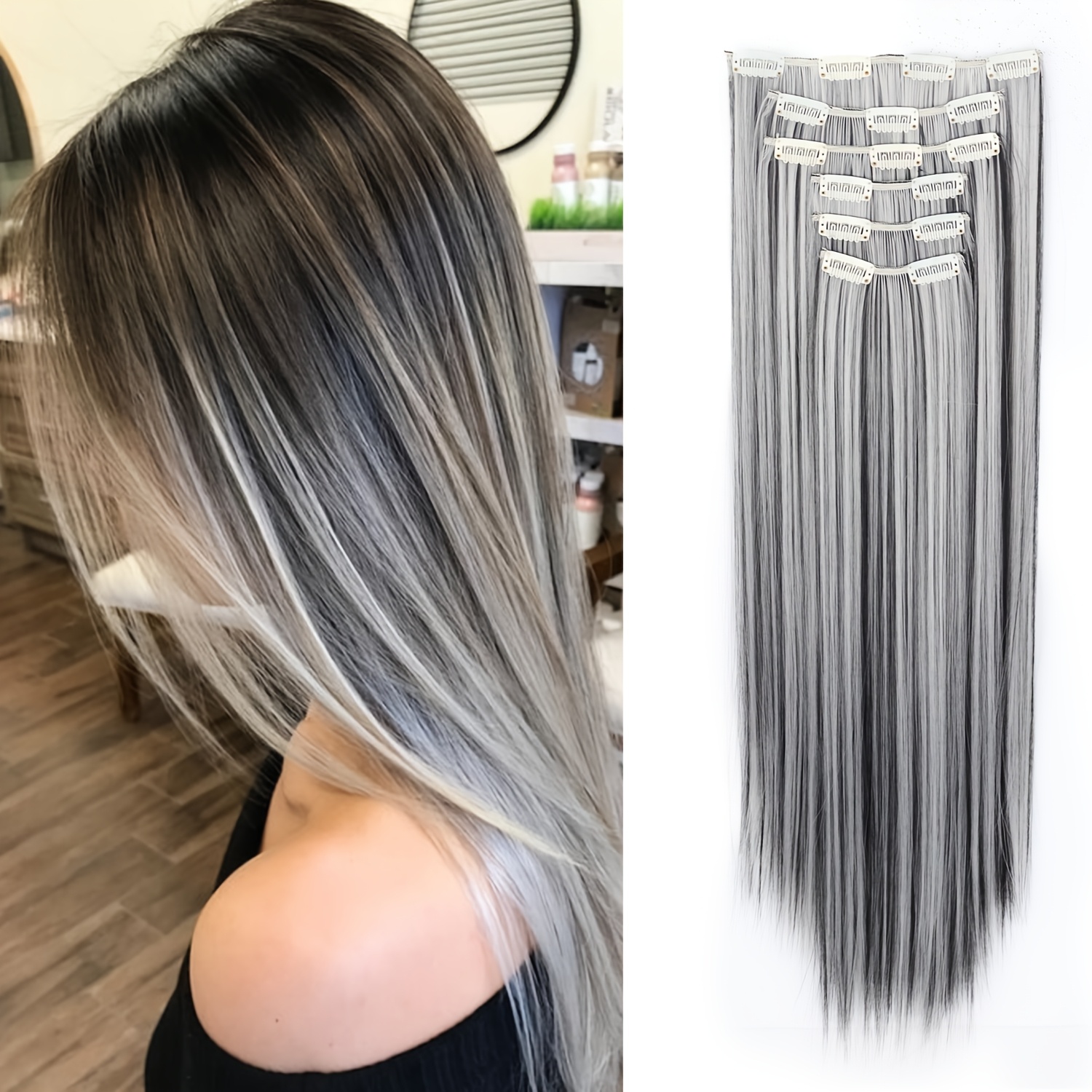 TEMU 24인치 16클립 인조 머리 확장 세트, 할로윈 스페셜, 직선 머리, 기본 스타일, 여성용, 고온 섬유, 할로윈 머리 액세서리|직선 머리 확장|내구성 있는 헤어피스