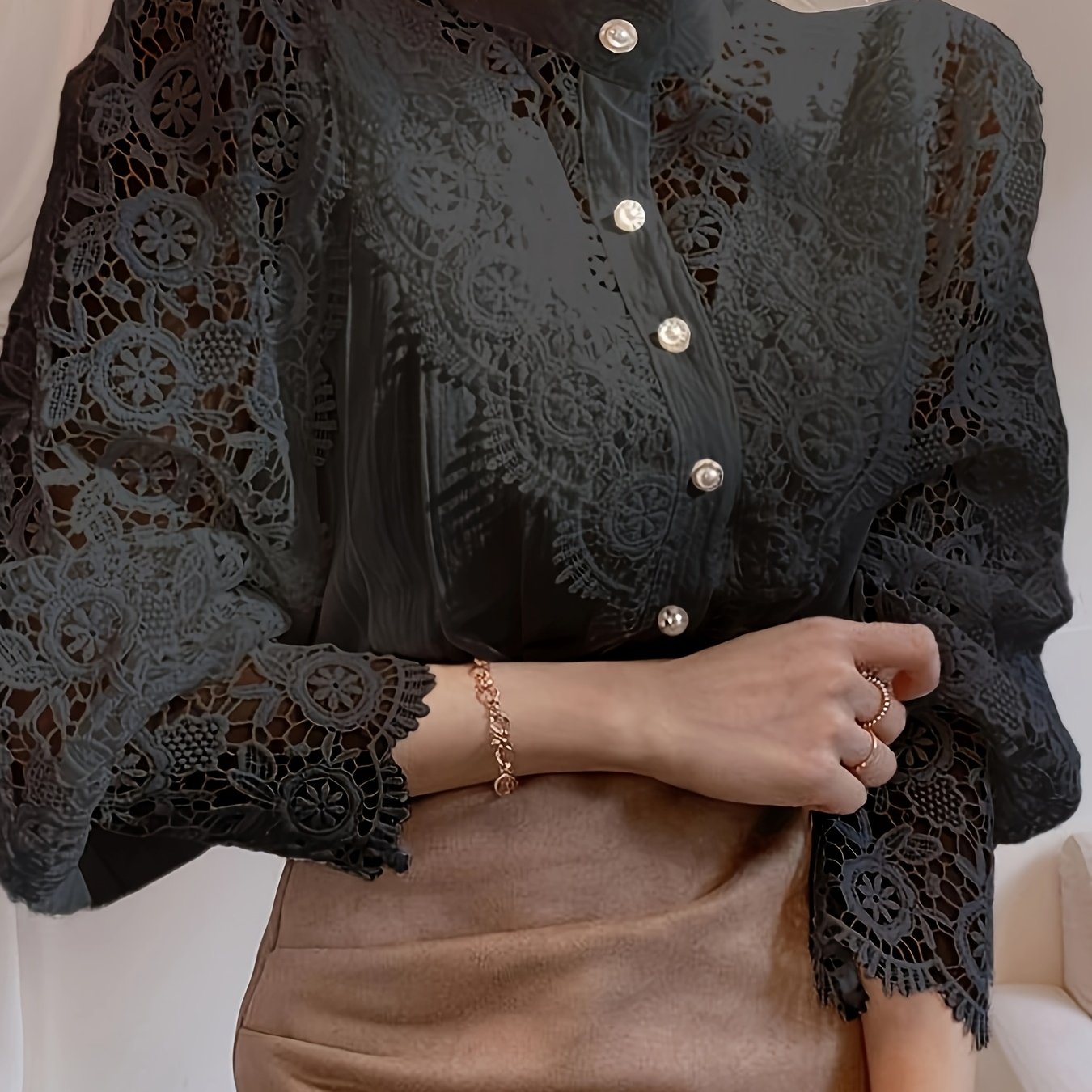 TEMU 여성을 위한 빈티지 스타일의 화이트 레이스 셔츠. 루즈하고 캐주얼한 핏, 속이 빈 코바늘 꽃무늬 패턴, 긴 소매가 특징입니다.