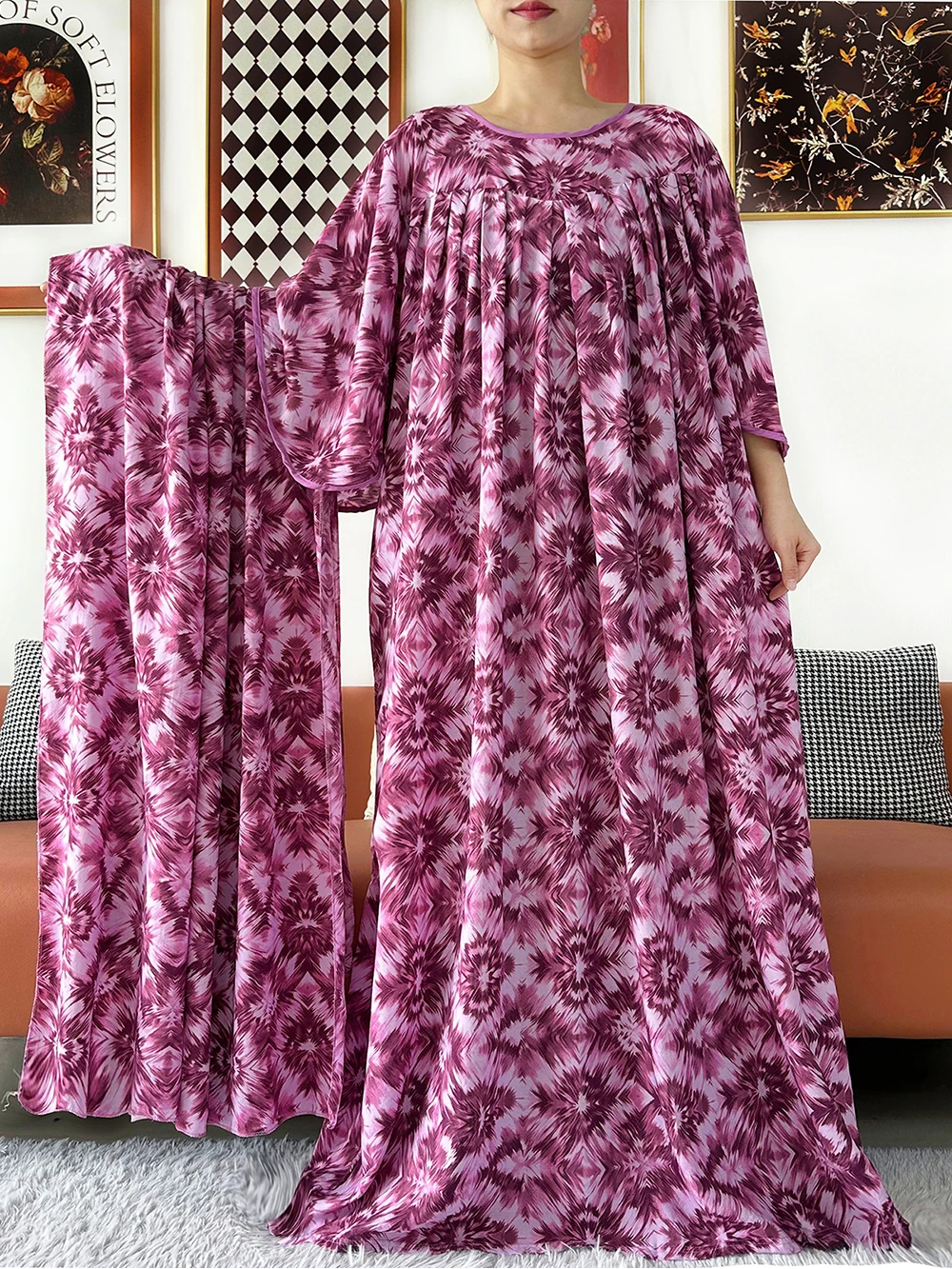 새로운 플로럴 드레스 반팔 O넥 코튼 여성 아바야 (큰 스카프 포함) 보헤미안 맥시 드레스 캐주얼 패션 드레스 아프리카 스타일 원피스