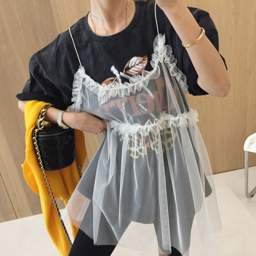 슈가 프릴 시스루 A라인 루즈핏 샤 뷔스티에 레이어드 끈 미니원피스 (2color)