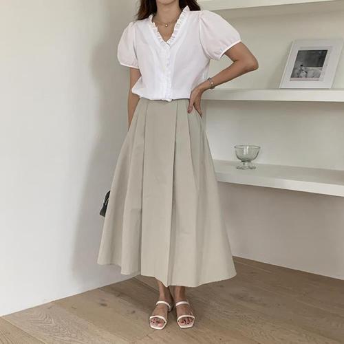 옷자락 / 여자 여름 퍼프 프릴반팔 박스핏 셔링 카라넥 셔츠