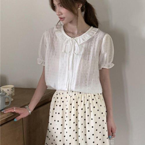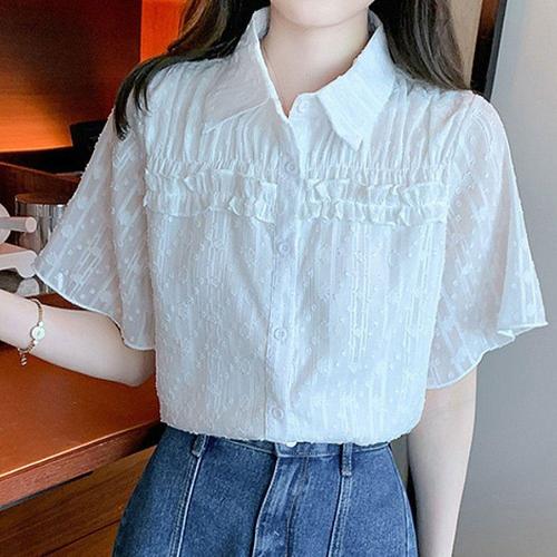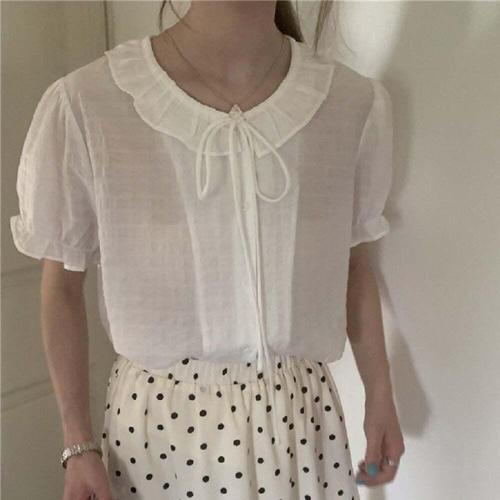 [오너클랜]인기상품 여성용 프릴 장식 화이트 카라 반팔 블라우스 여름 의류 [WFLHA38_260227]