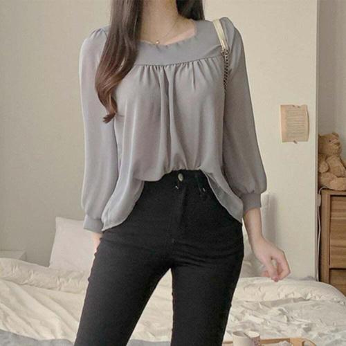 [오너클랜]인기상품 여자용 스퀘어넥 긴팔 프릴 셔링 노카라 블라우스 상의 [WFLIMPJ_260301]