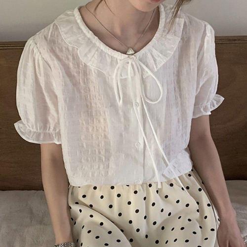 [오너클랜]인기상품 리본 장식 카라 반팔 여성용 데일리 프릴 블라우스 [WFLKWZG_260304]