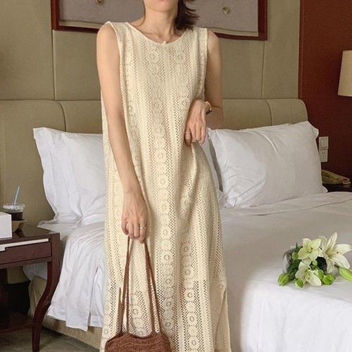 여성 민소매 아일릿 펀칭 레이스 나시 롱 원피스