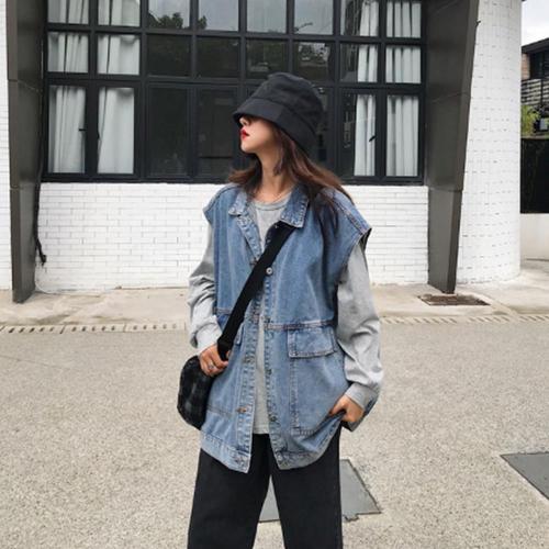 [콩심팥심]여자 간절기 캐주얼 루즈핏 브랙진 데님조끼 청조끼