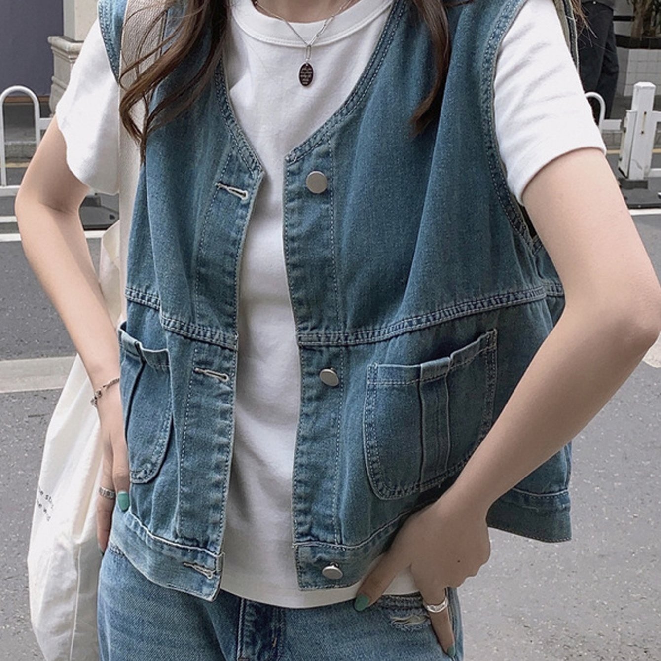 여성 패션 앞단추 데님 조끼 빈티지 V넥 민소매 여성 아우터웨어 시크 베스트 탑
