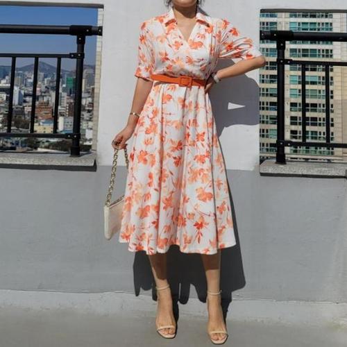 [바이어스]꽃 플라워 나염 벨트 브이넥 반팔 플레어 원피스 룩 (14672053)