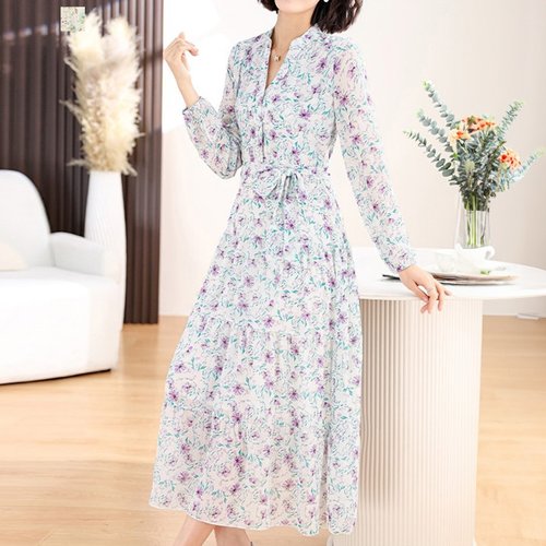 [퀸이즈] [~88까지]리톤 브이넥 플라워 나염 롱 원피스