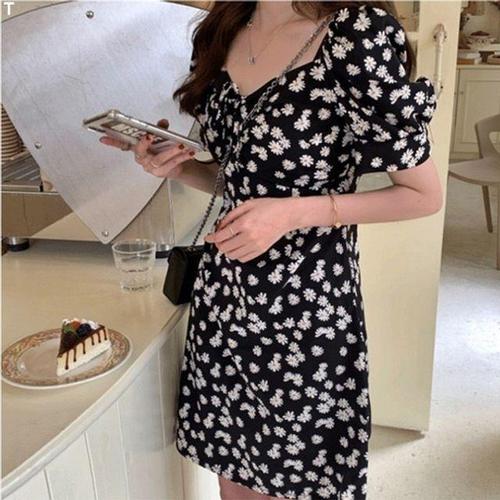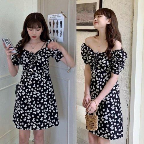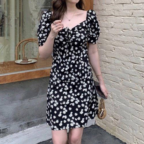 [오너클랜]인기상품 플라워 패턴 오프숄더 브이넥 여성용 반팔 미니 원피스 블랙 [WFLKX6Q_260304]