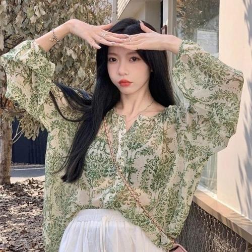 COSYEVNO 여성 남방 가을 라운드 쉬폰 퍼프소매 플라워 빅사이즈 심플 루즈핏 캐주얼 긴팔 미디 상의 CXJcs-08