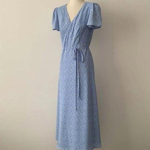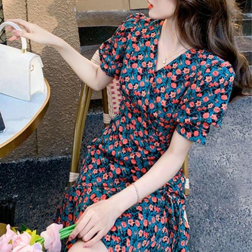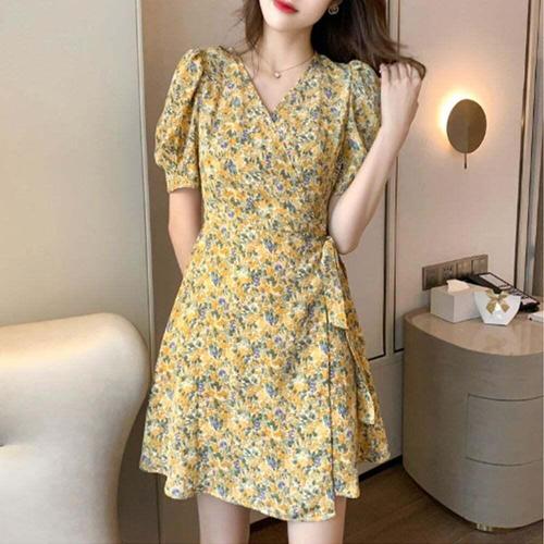 [오너클랜]인기상품 퍼프 여름 반팔 브이넥 랩 쉬폰 플라워 원피스 [WFLSRGX_260205]