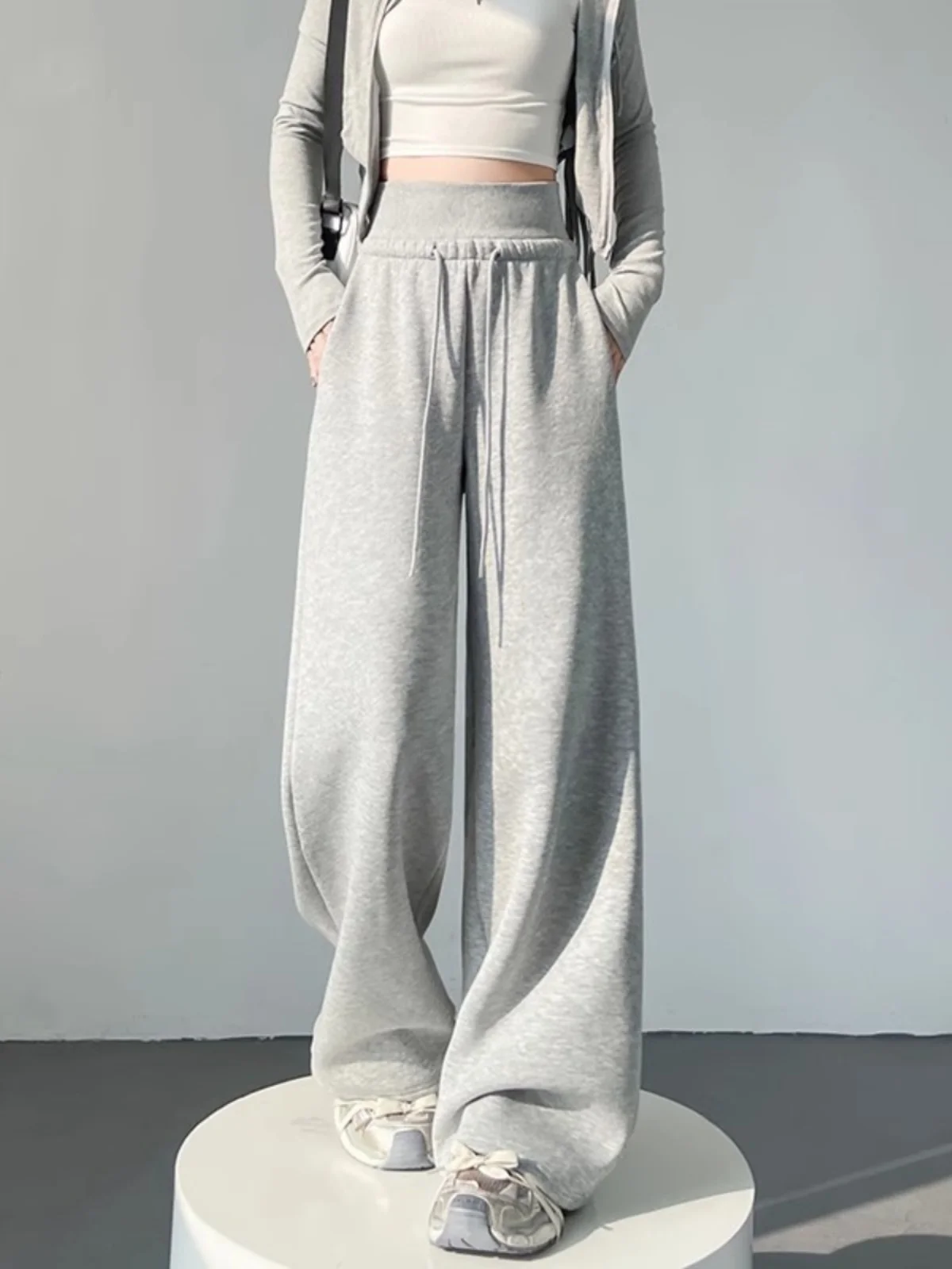 2025년 신상 아메리칸 스타일 플러스 사이즈 하이웨이스트 스트레이트 레그 팬츠 스포티한 슬림핏 그레이 와이드 레그 팬츠 여성 캐주얼 바지
