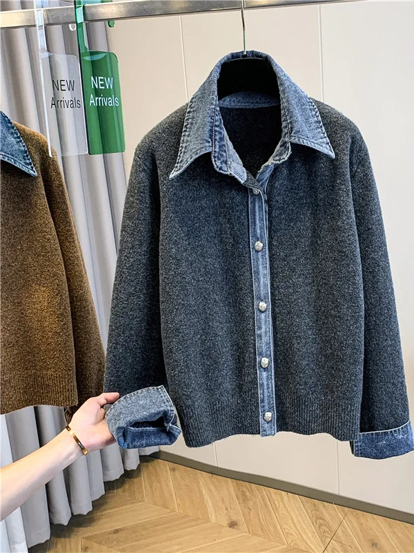 고급 일본 스타일 플러스 사이즈 패치워크 니트웨어 캐주얼 데님 재킷 여성용 예술적인 빈티지 디자인 루즈핏 긴팔