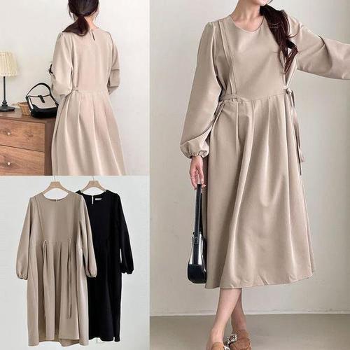 [퍼니걸스]루즈핏 라운드 배색 주름 플리츠 리본 긴팔 롱 원피스 6865 여성의류