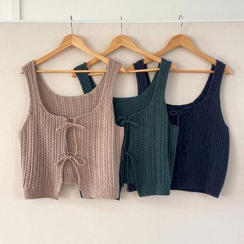 [다잇템]여성 리본 오픈 울 코디 그린 피셔맨 조끼