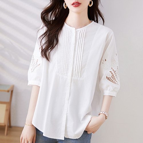 [옷자락]여자 블루 아이보리 자수 절개 루즈핏 핀턱 셔츠