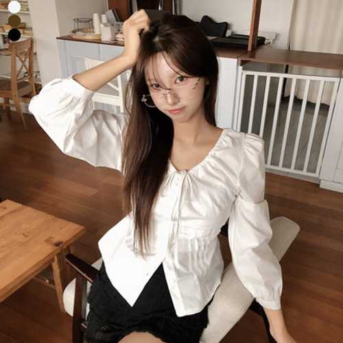 [옷자락]여성 펀칭리본 버튼 카라넥 핀턱 퍼프 오버핏 블라우스